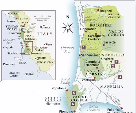 Bolgheri位于托斯卡納海岸Livorno省的Castagneto Carducci區,北臨Pisa市,南接Maremma地區,周邊環繞有Cecina河和Cornia河,葡萄園地勢平緩,總面積達1200公頃,氣候為溫和的地中海氣候。