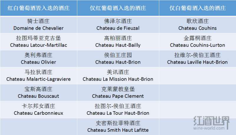 直到1953年,法國國家原產(chǎn)地命名管理局(Institut National des Appellations d'Origine,簡稱INAO)對格拉夫的紅葡萄酒進(jìn)行評級,并擬定了一份非官方名單,共有13座酒莊入選。1959年,該分級制度在原來的基礎(chǔ)上新添了對格拉夫干白葡萄酒的評級。在最終公布的官方名單中,共有16座列級莊入選,其中紅、白葡萄酒均入選的有6座,僅紅葡萄酒入選的有7座,僅白葡萄酒入選的有3座。