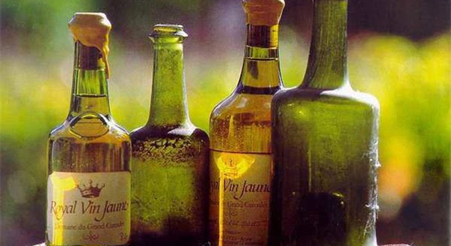 汝拉地區(qū)有生產(chǎn)一種特殊的葡萄酒,被稱為黃酒(Vin Jaune),在國際上的知名度很高,是汝拉人的驕傲。黃酒的瓶子叫 Clavelin 瓶,瓶身矮胖、結(jié)實(shí)、厚重,容量只有 620ml。黃酒以 100% 的薩瓦涅葡萄為原料,放入老勃艮第橡木桶中發(fā)酵并陳釀 6 年以上,期間不添桶。在木桶陳釀的過程中,酒液表面會(huì)產(chǎn)生一層酵母膜(Blanket/Voile),有點(diǎn)像雪利酒的酒花(Flor)。之所以是 620ml 的容量,據(jù)說這是因?yàn)辄S酒在完成 6 年的陳釀之后,酒液縮減至 62%。