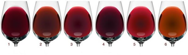 不同的葡萄品種由于葡萄皮的厚薄不一,所以帶給紅葡萄酒的顏色也不一樣。而且因為美國及澳洲等地日照時間較長,葡萄皮普遍因此曬得變厚,故此顏色也較法國、意大利等地方深。綜合來說,以最普遍的年輕葡萄品種比較,赤霞珠(Cabernet Sauvignon)偏向圖(1),美樂(Merlot)偏向圖(3), 西拉(Syrah/Shiraz偏向圖(4)及黑皮諾(Pinot Noir) 偏向圖(5)。