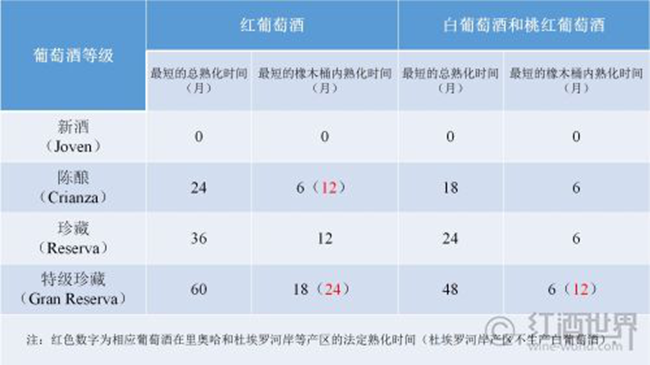 除了跟隨法國和歐盟的腳步之外,西班牙葡萄酒的分級也有著自己的特色,那就是對于DO及以上級別葡萄酒最短的總熟化時(shí)間和在橡木桶內(nèi)熟化時(shí)間的要求。西班牙根據(jù)熟化時(shí)間將葡萄酒分為4個(gè)等級:新酒(Joven)、陳釀(Crianza)、珍藏(Reserva)和特級珍藏(Gran Reserva),這幾個(gè)術(shù)語也是我們常在西班牙紅酒的酒標(biāo)上見到的。各級別對于熟化時(shí)間的要求見下表: