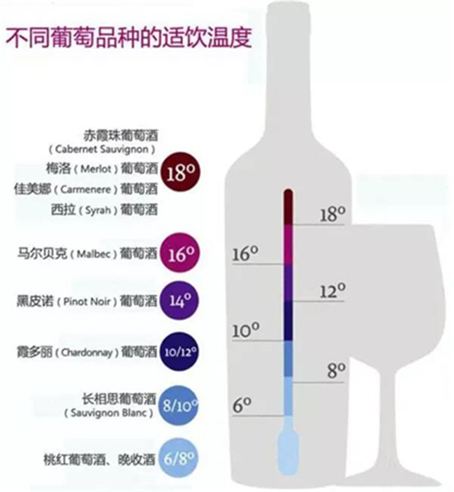 不同種類的葡萄酒飲用溫度不同,如起泡酒、白葡萄酒和紅葡萄酒的飲用溫度均不相同。