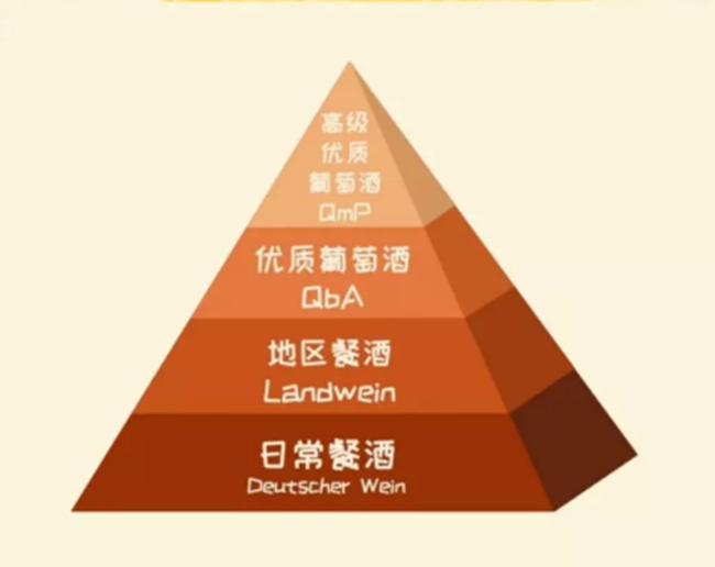 官方分級(jí)由1971年頒布的《德國(guó)葡萄酒法案》確立,適用于德國(guó)生產(chǎn)的所有葡萄酒,根據(jù)該分級(jí)制度,德國(guó)葡萄酒等級(jí)由低到高共分為:日常餐酒(Deutscher Wein)、地區(qū)餐酒(Landwein)、優(yōu)質(zhì)葡萄酒(Qualitatswein bestimmter Anbaugebiete,簡(jiǎn)稱QbA)和高級(jí)優(yōu)質(zhì)葡萄酒(Qualitatswein mit Pradikat,簡(jiǎn)稱QmP),其中高級(jí)優(yōu)質(zhì)葡萄酒也被稱作“ Pradikatswein”。