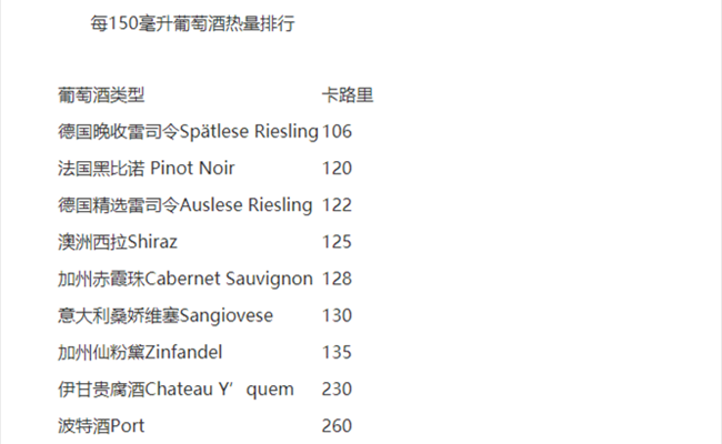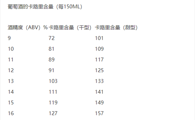 在常見的酒精飲料里面,葡萄酒的卡路里含量是比較低的。以每150ML計算,干型葡萄酒的卡路里大約在70~130之間波動,主要由葡萄酒的酒精含量決定。而甜型葡萄酒的卡路里含量則會更高一些(見下表)。