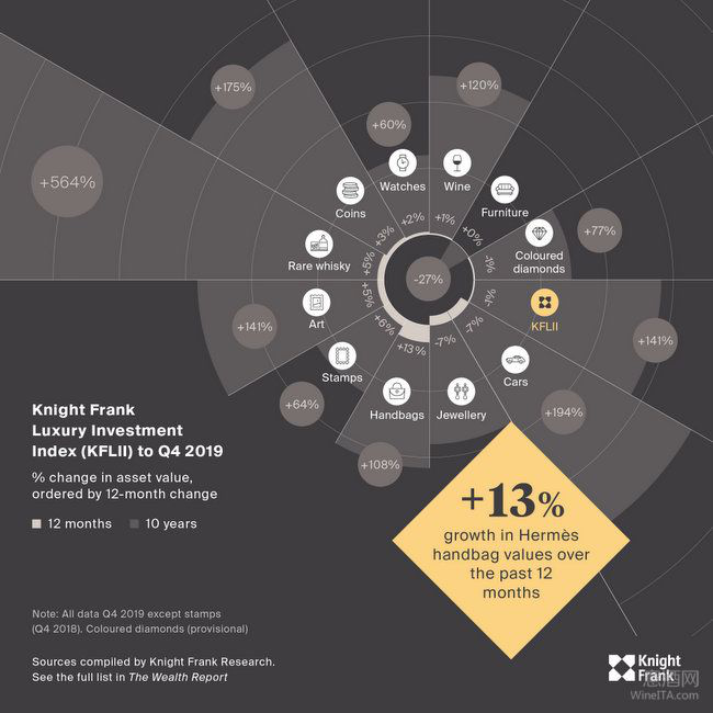 2019年,由于全球政治、經濟領域中多個不確定因素的影響,讓不少投資品領域增長乏力甚至出現負增長,例如珍稀威士忌投資指數只上升了5%,彩色鉆石、珠寶、名車等領域都初現了負增長,名貴家具投資指數零增長。