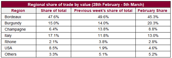 就交易總值份額而言,波爾多(47.6%)連續第二周低于指標50%。 免關稅的意大利份額則躍升(17.1%);當中2016年份占了該酒區交易超過55%。