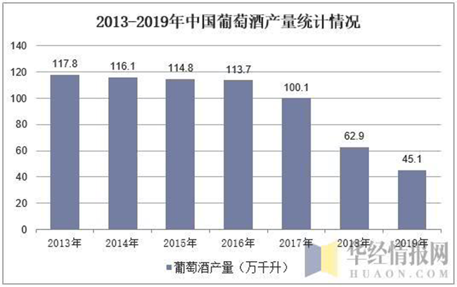 然而,目前中國(guó)的葡萄酒產(chǎn)業(yè)發(fā)展并不成熟,隨著我國(guó)國(guó)民生活質(zhì)量的提高,對(duì)高端葡萄酒需求增加,進(jìn)口葡萄酒快速蠶食國(guó)產(chǎn)葡萄酒市場(chǎng)份額,近年來中國(guó)葡萄酒產(chǎn)量持續(xù)下降,2019年中國(guó)葡萄酒產(chǎn)量達(dá)45.1萬(wàn)千升,與2018年相比減少了17.8萬(wàn)千升。