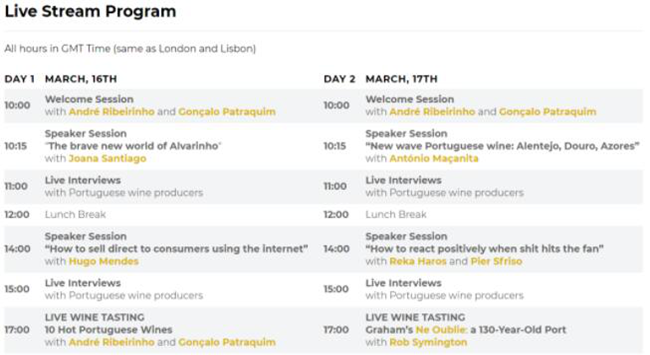 3月16日-17日,舉辦了為期兩天的虛擬現(xiàn)場(chǎng)直播交易活動(dòng),免費(fèi)幫助葡萄牙葡萄酒生產(chǎn)商展示他們計(jì)劃帶到國(guó)際貿(mào)易博覽會(huì)參展的葡萄酒。直播貿(mào)易目前以免費(fèi)的形式進(jìn)行,開(kāi)放注冊(cè)。