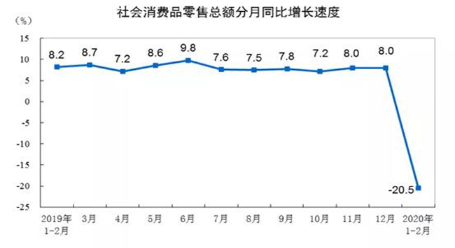 國內自1月份開始受到疫情沖擊,生產(chǎn)消費幾乎冰凍。1-2月份,社會消費品零售總額52130億元,同比名義下降20.5%(扣除價格因素實際下降23.7%,以下除特殊說明外均為名義增長),較去年12月大幅下滑28.5和28.2個百分點,其中僅糧油食品、飲料、藥品等少數(shù)維持正增長。(數(shù)據(jù)來源:國家統(tǒng)計局)
