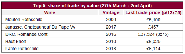 本月五大最高交易總值葡萄酒,分別來(lái)自三大一級(jí)酒莊、南羅納和勃艮第;而前十位也全是法國(guó)葡萄酒。 盡管波爾多(45.9%)份額保持不變,但勃艮第份額(12.5%)也有增長(zhǎng);這主要是受其白葡萄酒的交易增長(zhǎng)所推動(dòng)。