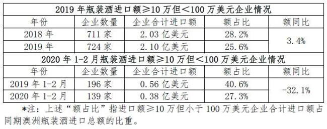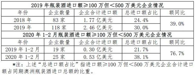 在2019年進(jìn)口葡萄酒市場(chǎng)大盤(pán)下行情況下,腰部企業(yè)(指進(jìn)口額≥100萬(wàn)但<500萬(wàn)美元的企業(yè))數(shù)量和合計(jì)進(jìn)口額均較快增長(zhǎng)。尤其是今年1-2月受到疫情不利影響下,腰部企業(yè)進(jìn)口總額增幅近8成,使得其市場(chǎng)份額占比高于去年同期超16個(gè)百分點(diǎn)。