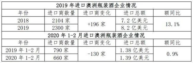 從上表數(shù)據(jù)可以看出,近兩年進(jìn)口澳洲葡萄酒企業(yè)數(shù)量持續(xù)增長(zhǎng),說(shuō)明澳洲酒在華市場(chǎng)越來(lái)越受到進(jìn)口商的青睞。受疫情對(duì)行業(yè)的影響,今年1-2月較之去年同期進(jìn)口商數(shù)量有所減少,但進(jìn)口額逆勢(shì)上行,在眾多供應(yīng)國(guó)中表現(xiàn)十分搶眼。