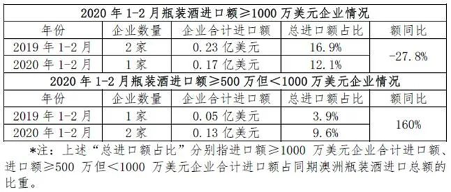 今年1-2月,盡管疫情對(duì)行業(yè)有一定沖擊,但澳洲瓶裝酒進(jìn)口頭部企業(yè)基本穩(wěn)住陣腳。雖然進(jìn)口額≥1000萬(wàn)美元的企業(yè)僅1家,少于去年同期,但其進(jìn)口額同比增長(zhǎng)近30%;而進(jìn)口額≥500萬(wàn)但小于1000萬(wàn)美元的企業(yè)有2家,數(shù)量增加,其中,1家進(jìn)口額實(shí)現(xiàn)倍數(shù)增長(zhǎng),1家為新的行業(yè)進(jìn)入者。