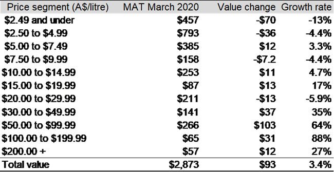 截至 2020 年 3 月底的 12 個(gè)月中,出口額最大的降幅主要出現(xiàn)在價(jià)格低于 5 澳元/升(離岸價(jià))的澳大利亞葡萄酒。相反,價(jià)格高于 10 澳元/升(離岸價(jià))的葡萄酒出口額則增長了 22%至 10.8 億澳元,特別是價(jià)格區(qū)間在 50 至 99.99 澳元之間的葡萄酒成為驅(qū)動(dòng)澳大利亞葡萄酒出口額增長的主力軍。