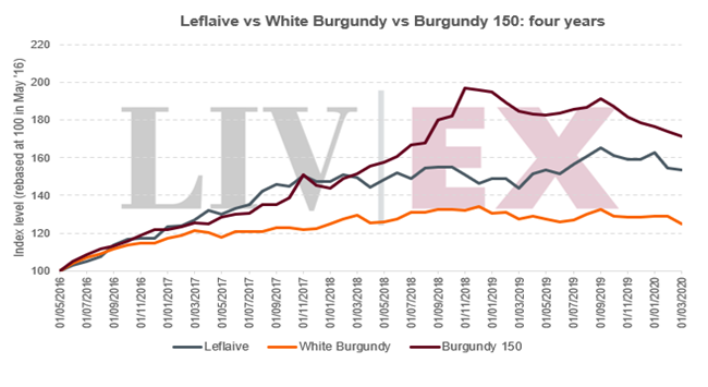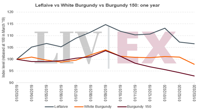 然而,在過去的一年,勒弗萊(6.5%)的表現(xiàn)也優(yōu)于勃艮第150(-7.2%)。 事實上,勃艮第150指數(shù)是表現(xiàn)最差的Liv-ex 1000分項指數(shù); 我們在最近的專題報告: 高峰后的勃艮第 中也探討了它的跌勢。
