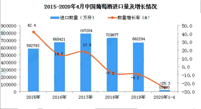 近日,中國海關發布相關數據顯示:2020年1-4月中國葡萄酒進口數量為15990萬升,相比上年同期減少了90513.6萬升,降幅為25.3%。