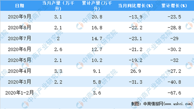 據中商產業研究院數據庫顯示,2020年9月全國葡萄酒產量增長,2020年9月全國葡萄酒產量為3.1萬千升,同比下降13.9%。2020年1-9月全國葡萄酒產量為20.8萬千升,同比下降23.5%。