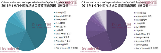 根據海關發布的數據顯示,今年一月到九月,中國市場瓶裝葡萄酒進口量同比上升38.7%,達3.0億升,進口額上升34.7%,達14億美元。其中,法國和澳大利亞葡萄酒進口增長顯著。這表示,中國進口葡萄酒市場在2015年前三季度強勢回暖。