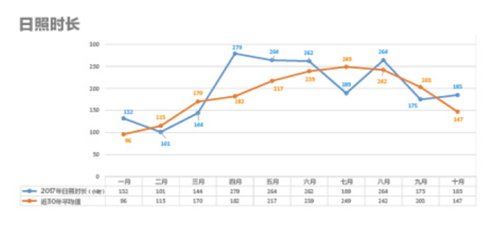一月 多數時間氣候干燥,日照充盈,降雨量不夠充沛。日照時間相較于季度平均值多出37小時。
