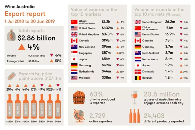 目前中國(包括香港和澳門地區(qū))是澳大利亞葡萄酒最大的出口市場,出口額占整體的42%,相比2018年中的數(shù)據(jù)(40%)仍然有所增加。美國(15%)和英國(13%)則僅次于中國。