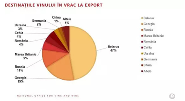 白俄羅斯、格魯吉亞以及俄羅斯進口的葡萄酒總量占摩爾多瓦出產散裝葡萄酒總量的77%。格魯吉亞散裝葡萄酒出口增長(+34%),捷克共和國和中國的進口量保持穩(wěn)定,而德國(-55.3%)、羅馬尼亞(-43.7%)、烏克蘭(-43.5%)以及白俄羅斯(-2.7%)的進口量有所下降。