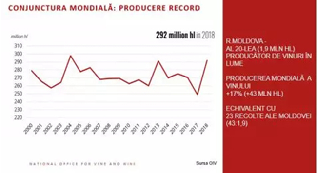 不僅是摩爾多瓦共和國正在經(jīng)歷葡萄酒生產過剩。2018年全球葡萄產量也達到了創(chuàng)紀錄的水平(+17%,即430萬千升),增長量相當于摩爾多瓦共和國23年的葡萄收獲量。