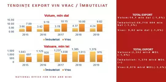 2018-2019年度,摩爾多瓦葡萄酒出口量呈現微跌態勢,但摩爾多瓦國家葡萄與葡萄酒局表示,在過去數年間,摩爾多瓦一直設法保持主要出口指標相對穩定,更是連續兩次取得創紀錄的豐收,出口量雖然下跌但影響甚微。