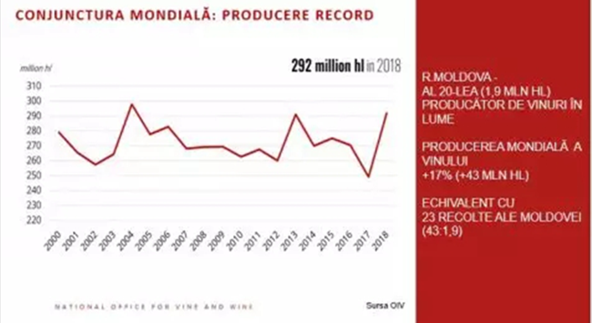 摩爾多瓦國家葡萄與葡萄酒局表示,在過去10年里,2018年全球2920萬千升,相反,包括摩爾多瓦在內的世界葡萄酒消費量小跌至2440萬千升。