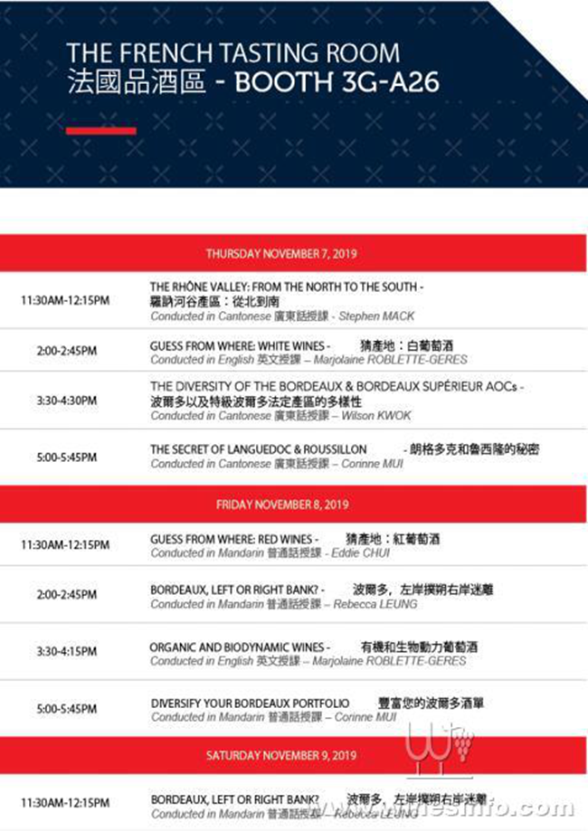 今年酒界盛事香港國際美酒展(11 月 7 至 9 日)將迎來 70 多家法國展商。佔地約 513 平方米的法國館位于香港會議展覽中心 3F-G,由法國商務投資署(Business France)及新阿基坦大區食品協會 (AANA)籌辦。在香港市場排名第一的法國葡萄酒和烈酒分別佔 60%及 40%市場份額。 French Tasting Room 品酒區繼去年成功推出后,今年將重現法國館。法國展商將在共 9 場主題品酒環節上陳列各款佳釀,這對于進口商、專業人士及業馀愛好者來說是一個難能可貴的大滿足機會,品嚐出產自法國的純釀。