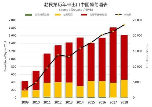 2018年勃艮第出口了1600萬瓶葡萄酒到中國大陸,這個數量比2017年同期降低了10.6%,但出口價值達到了2350萬歐元,比2017年同期上漲了9.9%。