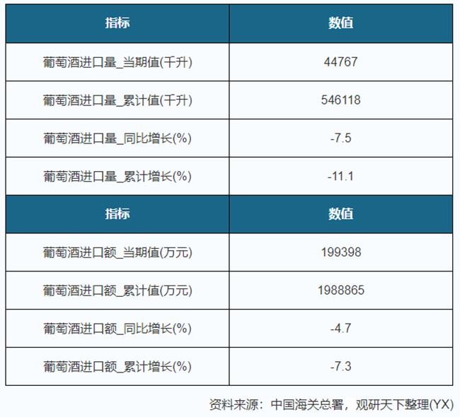 2019年10月我國葡萄酒進口量為44767千升,同比下降7.5%,進口金額為199398萬元,同比下降4.7%;1-10月進口量為546118千升,累計下降11.1%,進口金額為1988865萬元,累計下降7.3%。