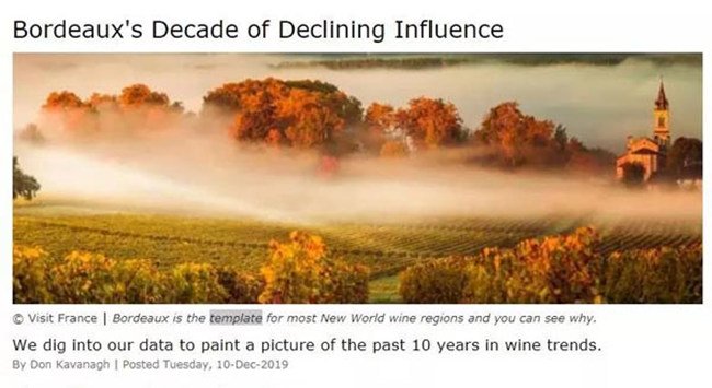最近,葡萄酒搜索引擎“葡萄酒搜索器”(Wine-searcher)將其2019年的葡萄酒搜索數(shù)據(jù)與2010年的進行了對比,并總結(jié)出數(shù)據(jù)的各種不同之處,發(fā)表題為《波爾多影響力衰退的十年》的文章。