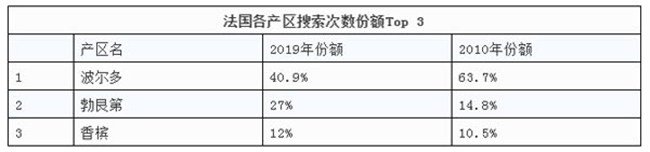 在2010年,以產(chǎn)區(qū)劃分搜索次數(shù)最多的依次為波爾多、加州、勃艮第、香檳、托斯卡納、羅納河谷、皮埃蒙特、南澳、杜羅河、威尼托。2019年,托斯卡納超越了香檳,皮埃蒙特超越了羅納河谷,威尼托超越了杜羅河。