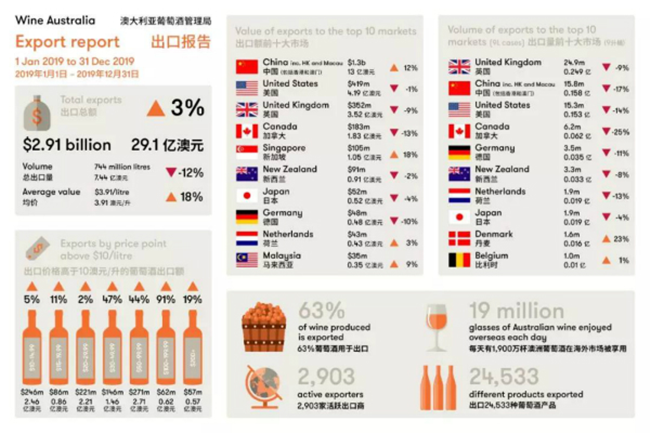 截至2019年12月底的12個月中,澳大利亞葡萄酒對中國市場(包括香港和澳門)的出口額增長12%,創下12.8億澳元新高,出口量下滑17%至1.42億升 (等量于1580萬箱9升裝)。平均出口額增長35%至8.99澳元(每升離岸價)。澳大利亞葡萄酒對中國市場的出口總額及平均出口額雙雙創下了年度新高。