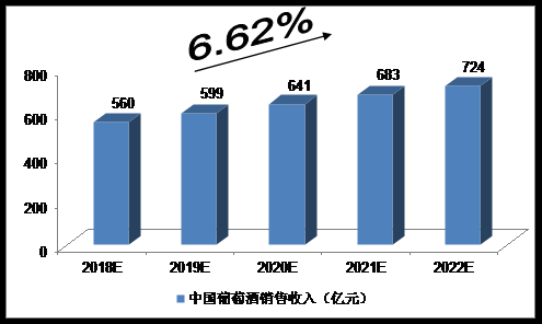 2016年,全國規模以上葡萄酒企業共240家,累計實現銷售收入484.54億元,同比增長3.97%。我們預計,2018年我國葡萄酒銷售收入將達到560億元,未來五年(2018-2022)年均復合增長率約為6.62%,2022年將達到724億元。