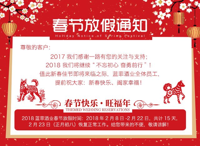 新年的鐘聲即將敲響,根據(jù)國家春節(jié)假期通知及藍(lán)菲公司的實(shí)際情況,確定于2018年2月9日-2月22日,共14天,為藍(lán)菲酒業(yè)春節(jié)假期,于2018年2月23日(正月初八)正式上班,請好朋友們悉知。同時(shí)在此提前恭祝,新春快樂!